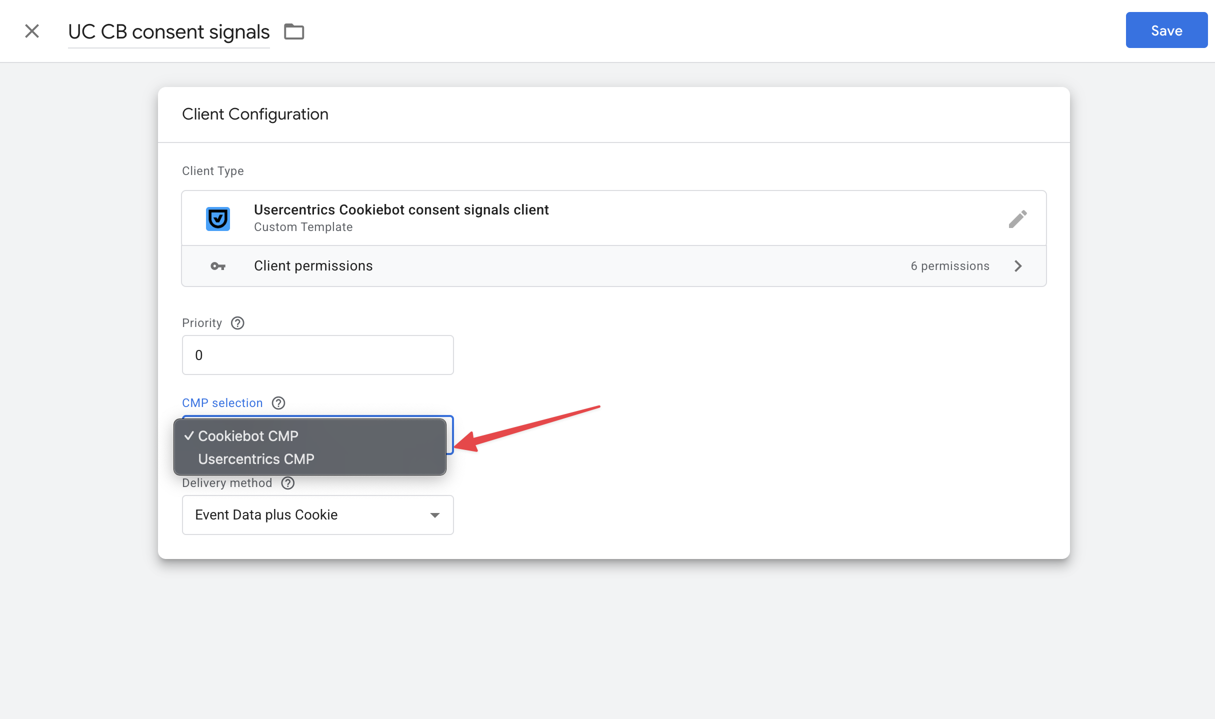 Select the CMP you're using on your website (Cookiebot or Usercentrics Web CMP).