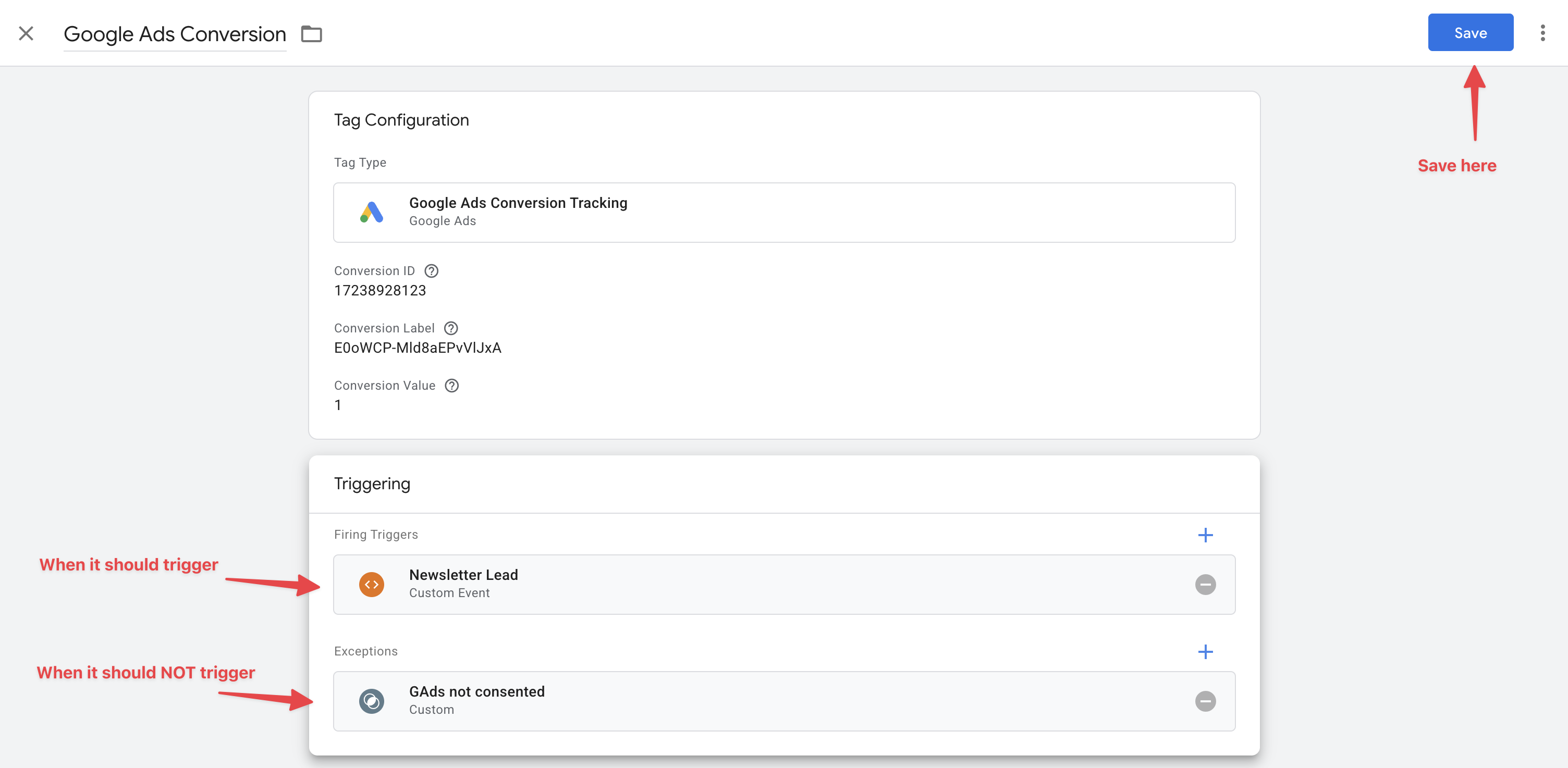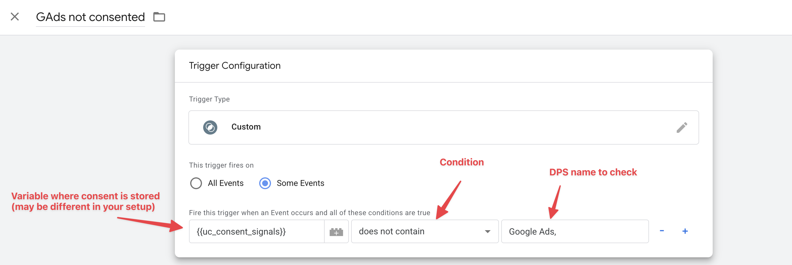 Add a name for the trigger (e.g. “Events without Ads consent”) and save it.