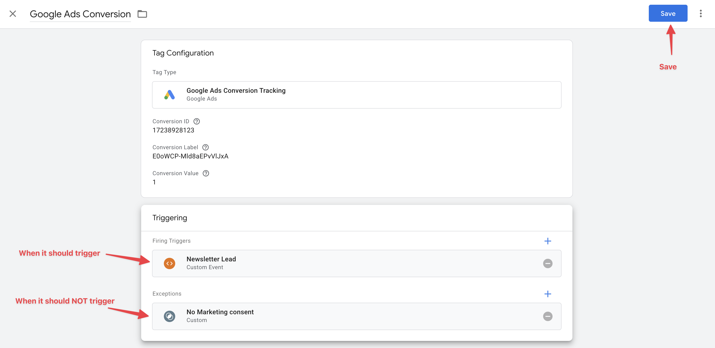 necessary,preferences,statisticsormarketing). For this example, it’ll bemarketing. This means that the tag will not trigger if this condition is verified.