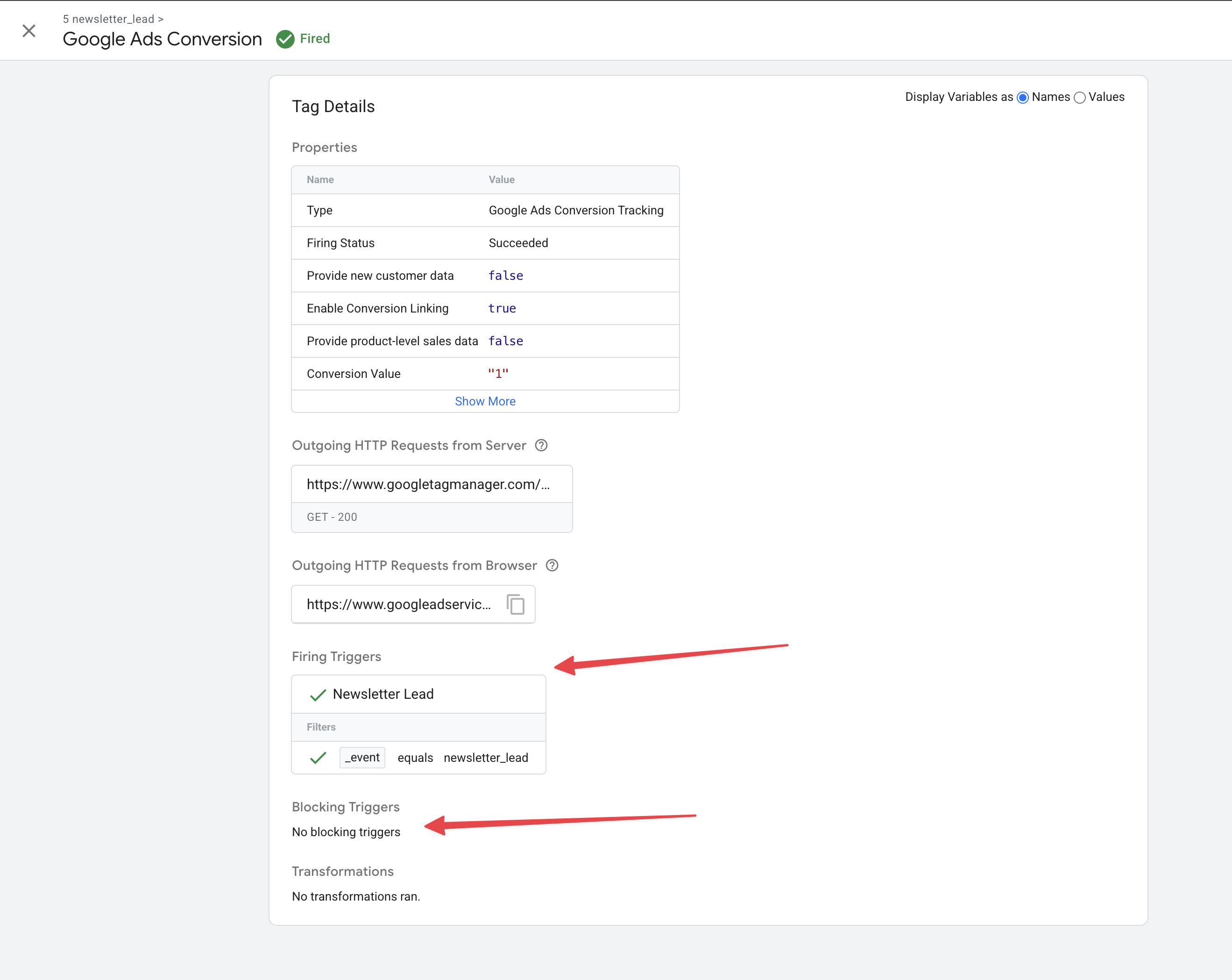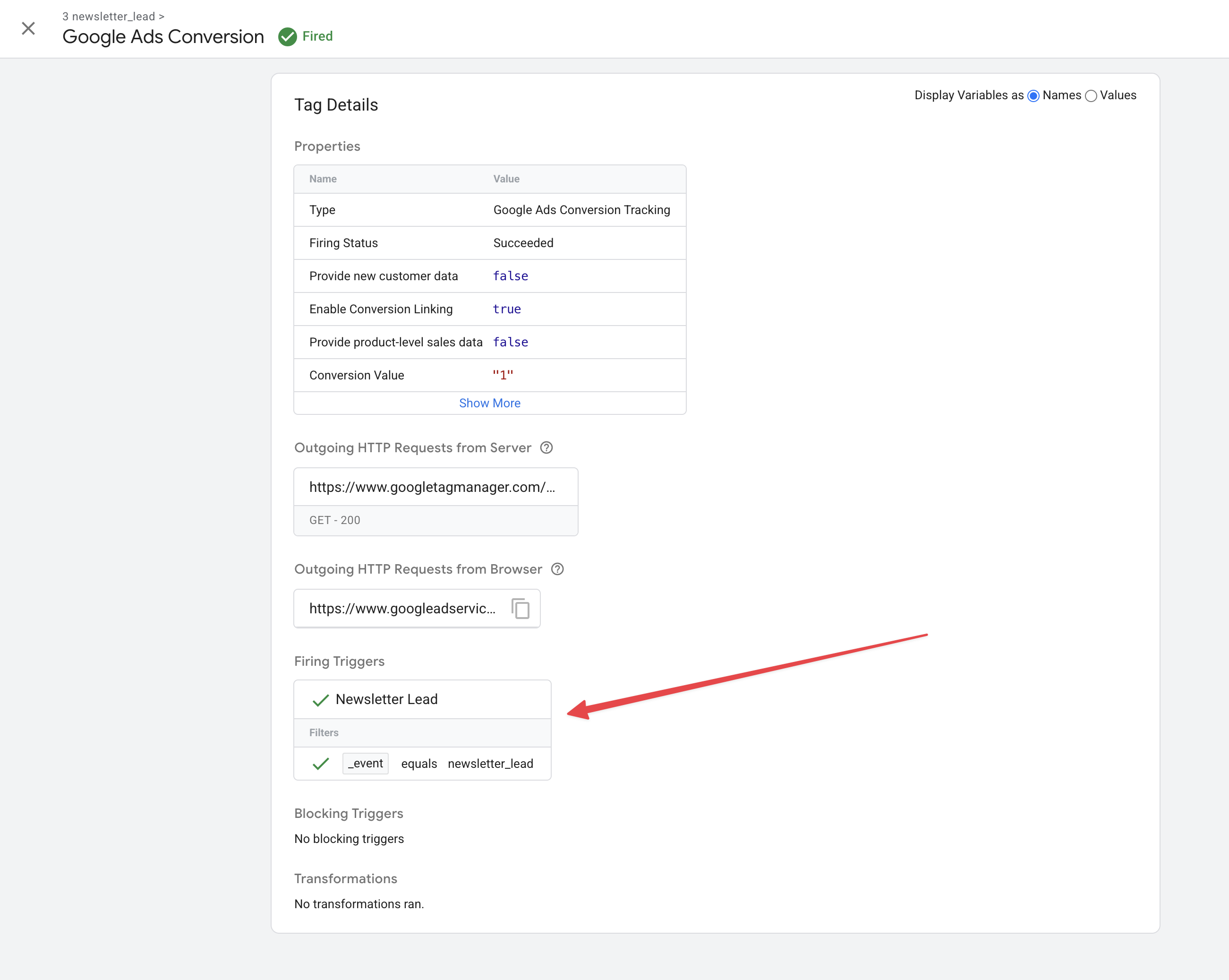 newsletter_leadcustom event from before (but you could use the Google Analytics 4 tag with thepage_viewevent for easier testing). You should see the tag firing on the server container preview mode.