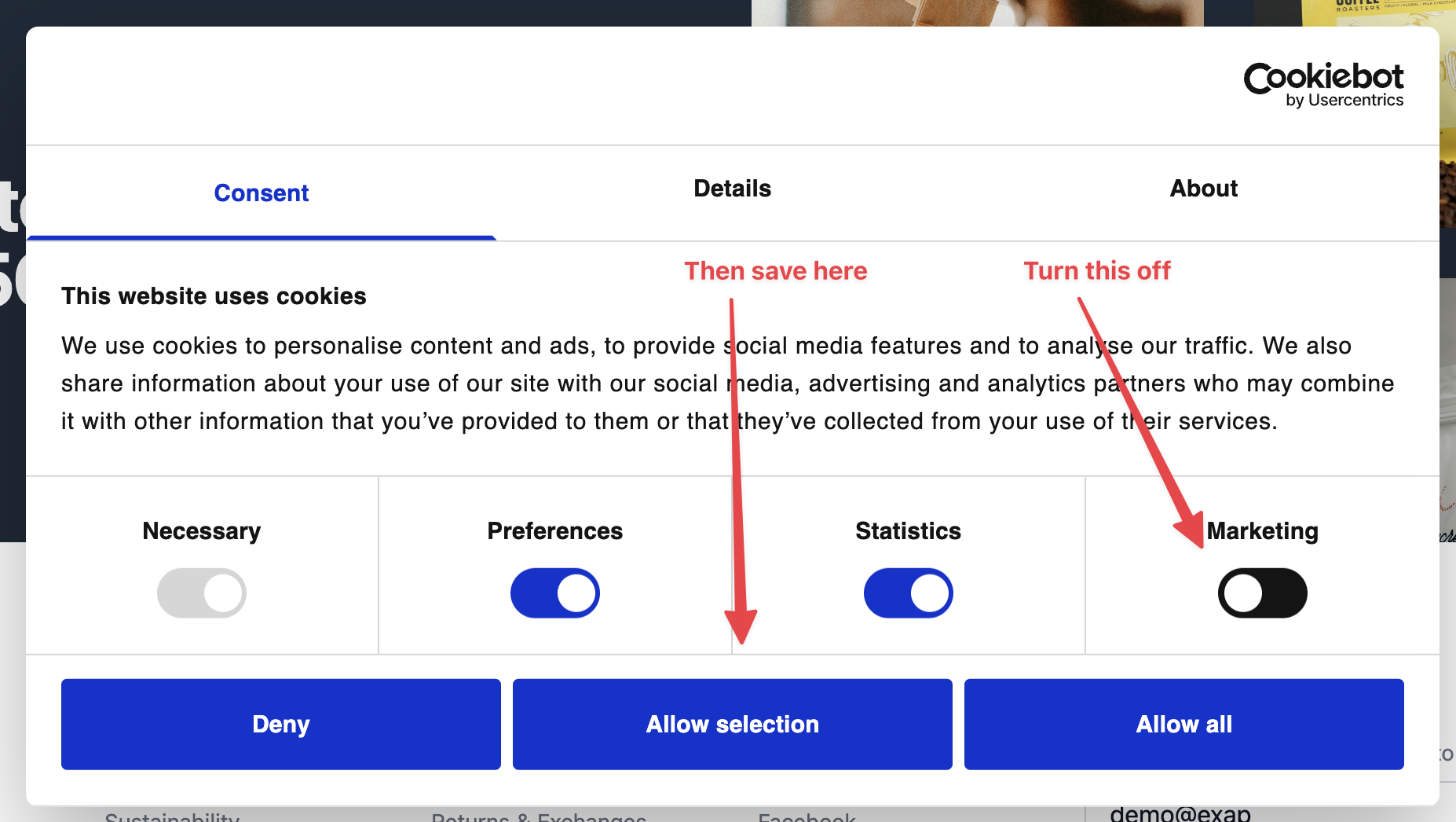 Now go back to the site, deny the Marketing category in the CMP settings and save.