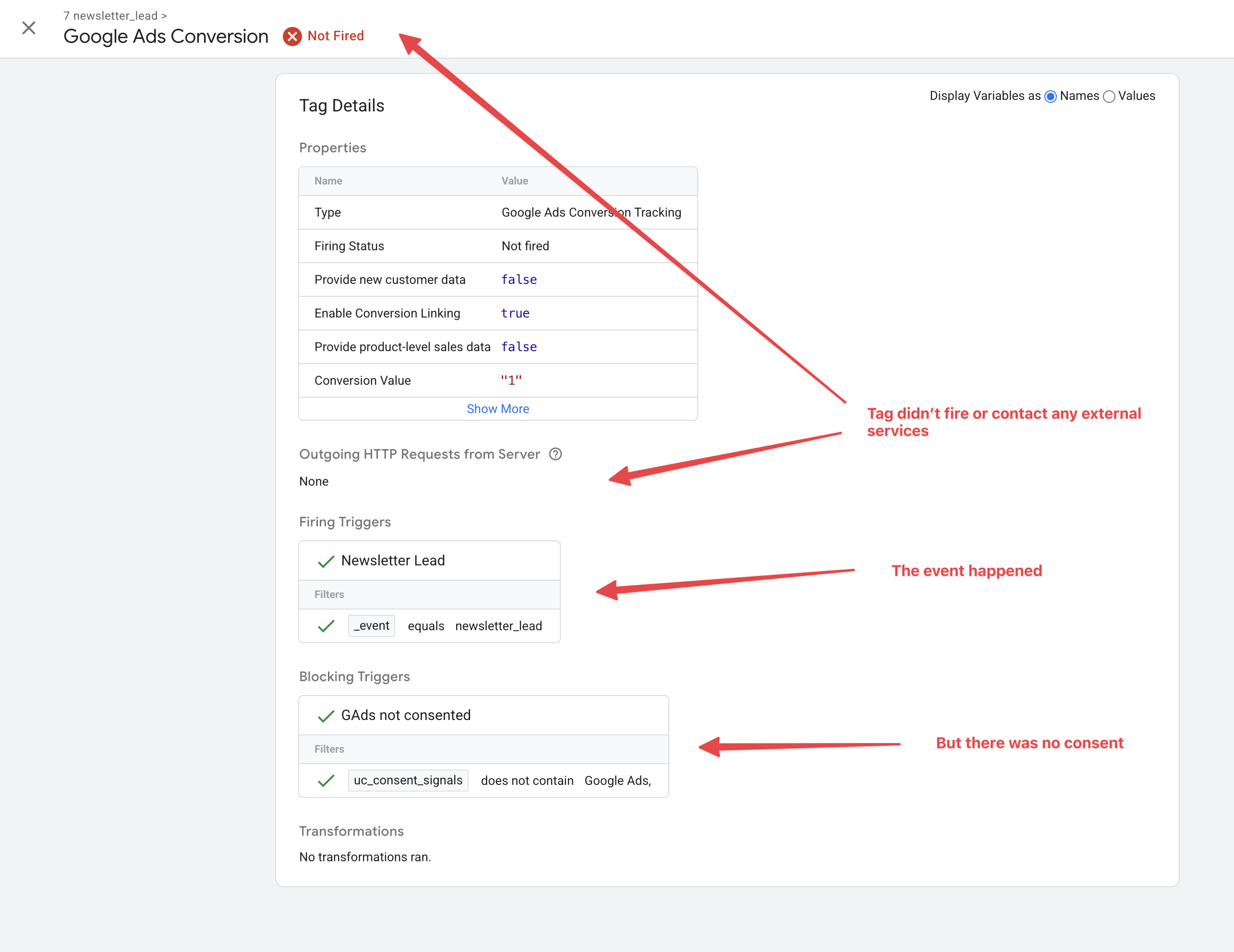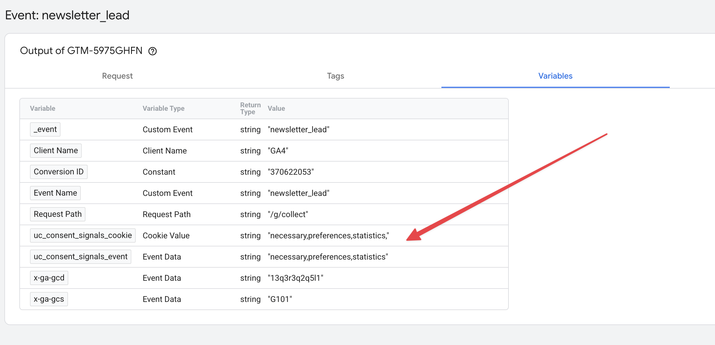 page_viewor in our example here,newsletter_lead). You should see that Google Ads is not included in the list of consented services.