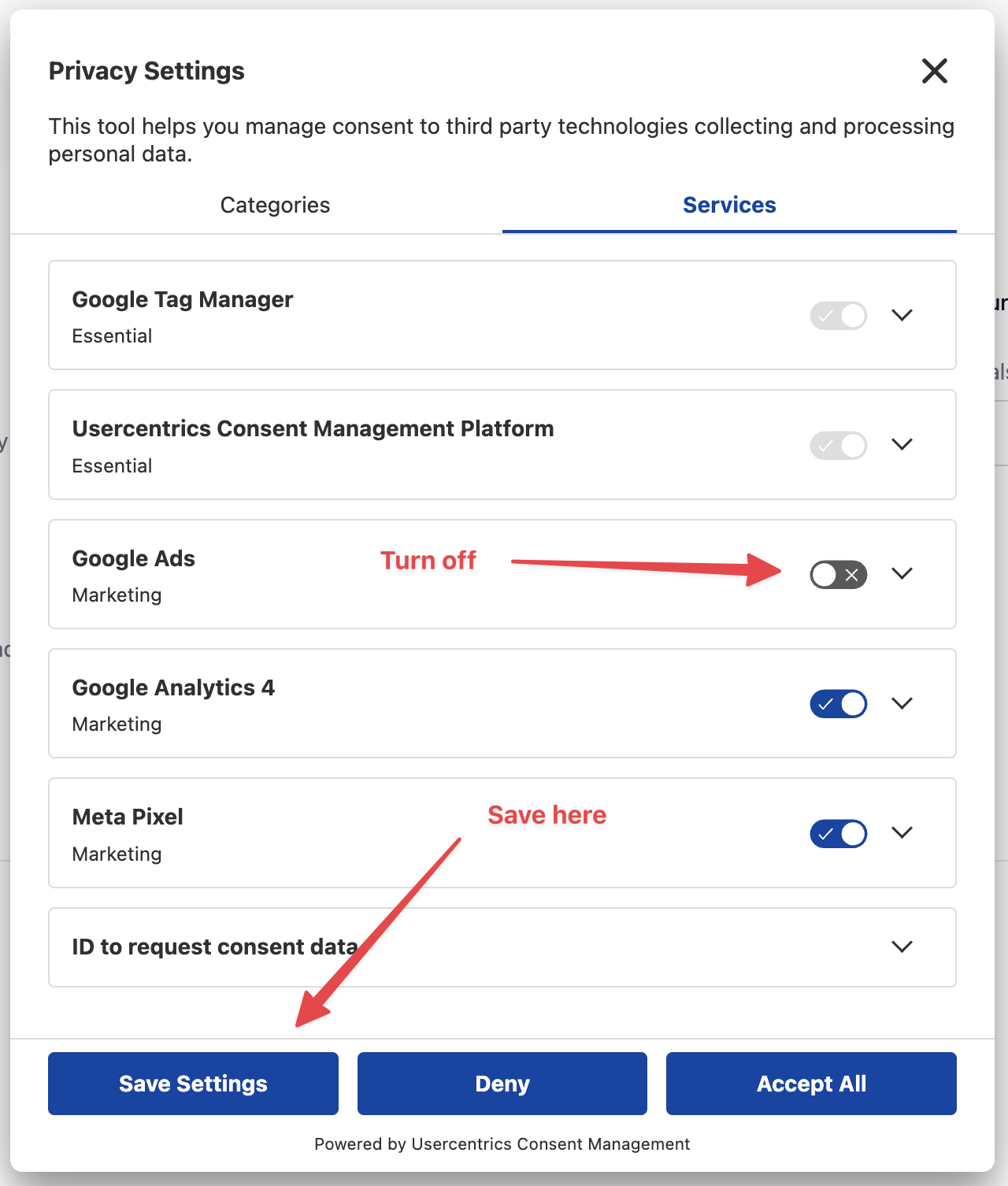 Now go back to the site, deny the Google Ads service in the CMP settings and save them.