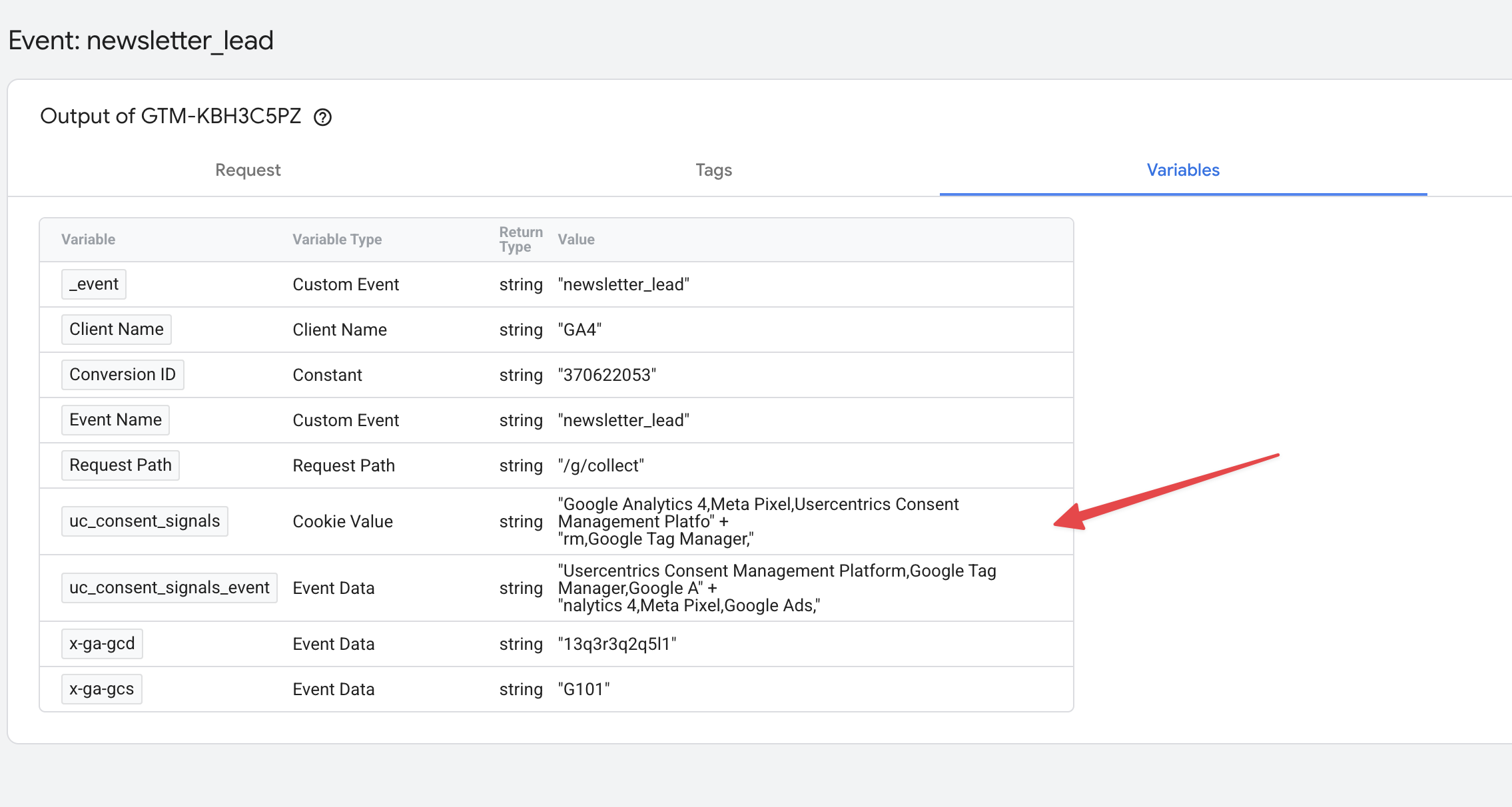 This will automatically add this parameter to all events using this Google tag configuration. To test it's working as expected, go to Preview Mode and inspect the Page View event. You should see the parameter containing a list of consented categories (with Cookiebot) or services (with Usercentrics Web CMP).