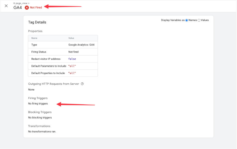 You should also see that the tag did not fire because the Exception trigger condition was verified.