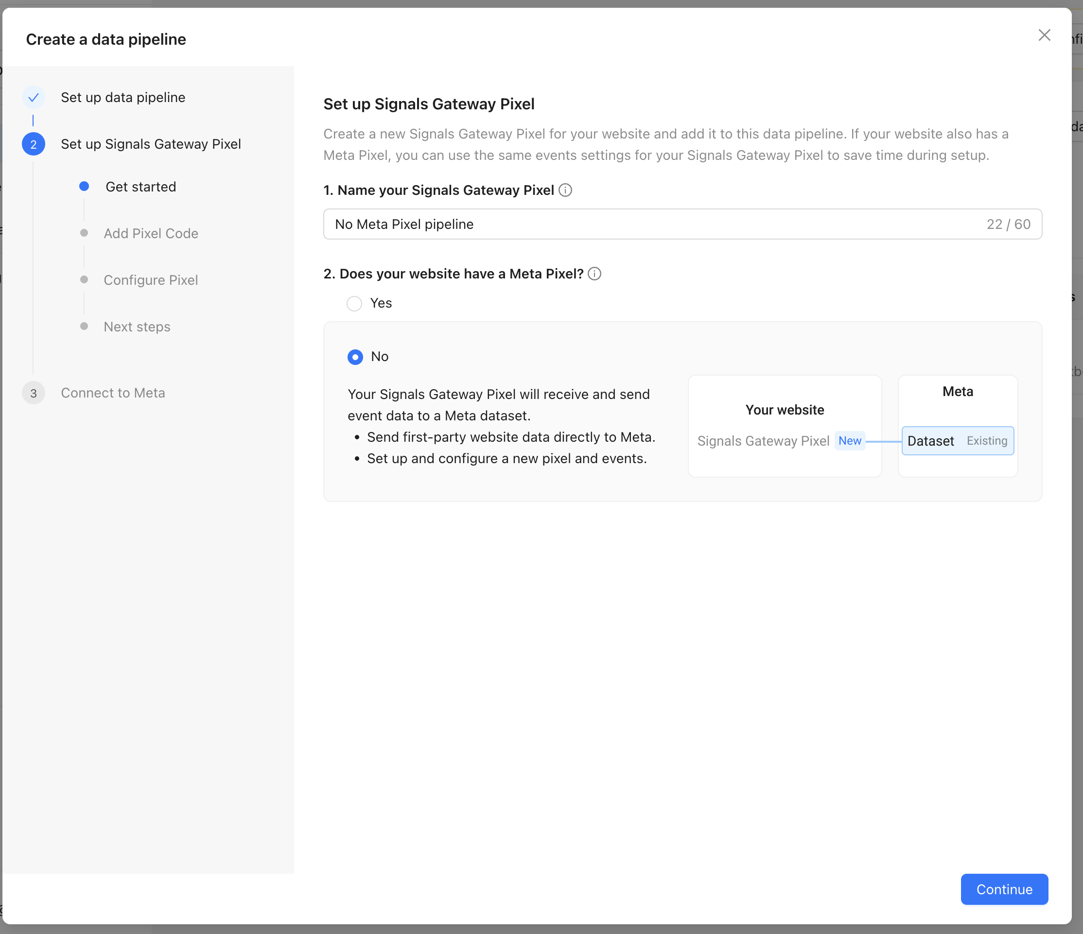 If your website doesn’t have a Meta Pixel, select No in this screen and click Continue.