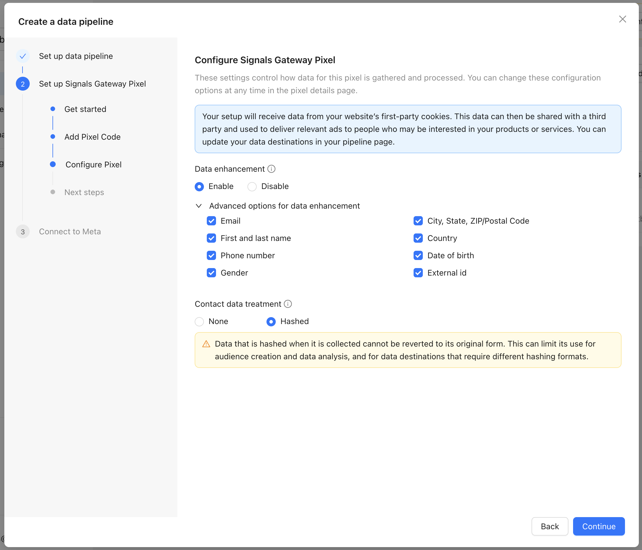 You will be asked to set up Data Enhancement. Choose the data you’re most comfortable with (see example below), and click Continue.