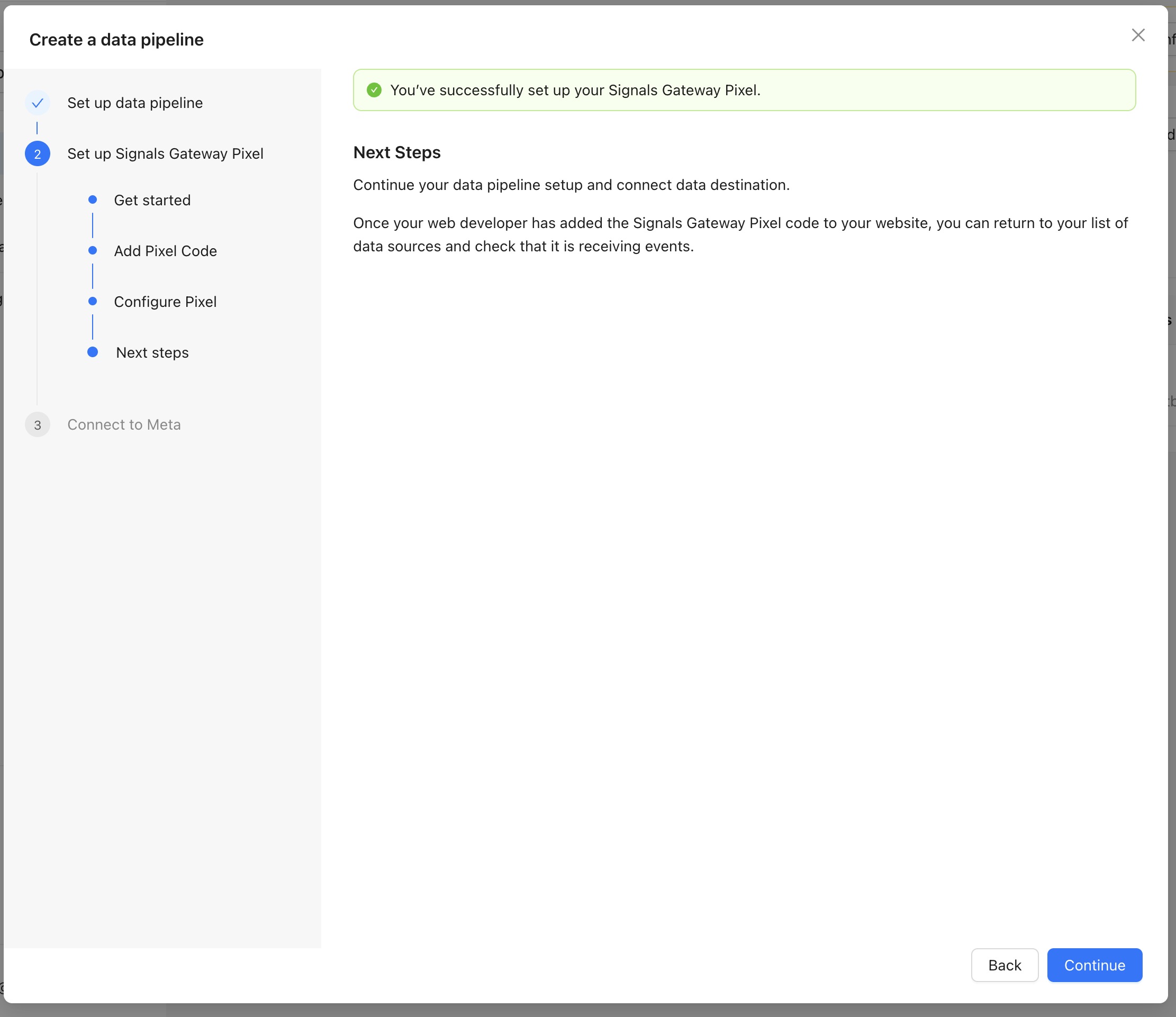 You should see confirmation that the pixel was set up correctly, then click Continue.