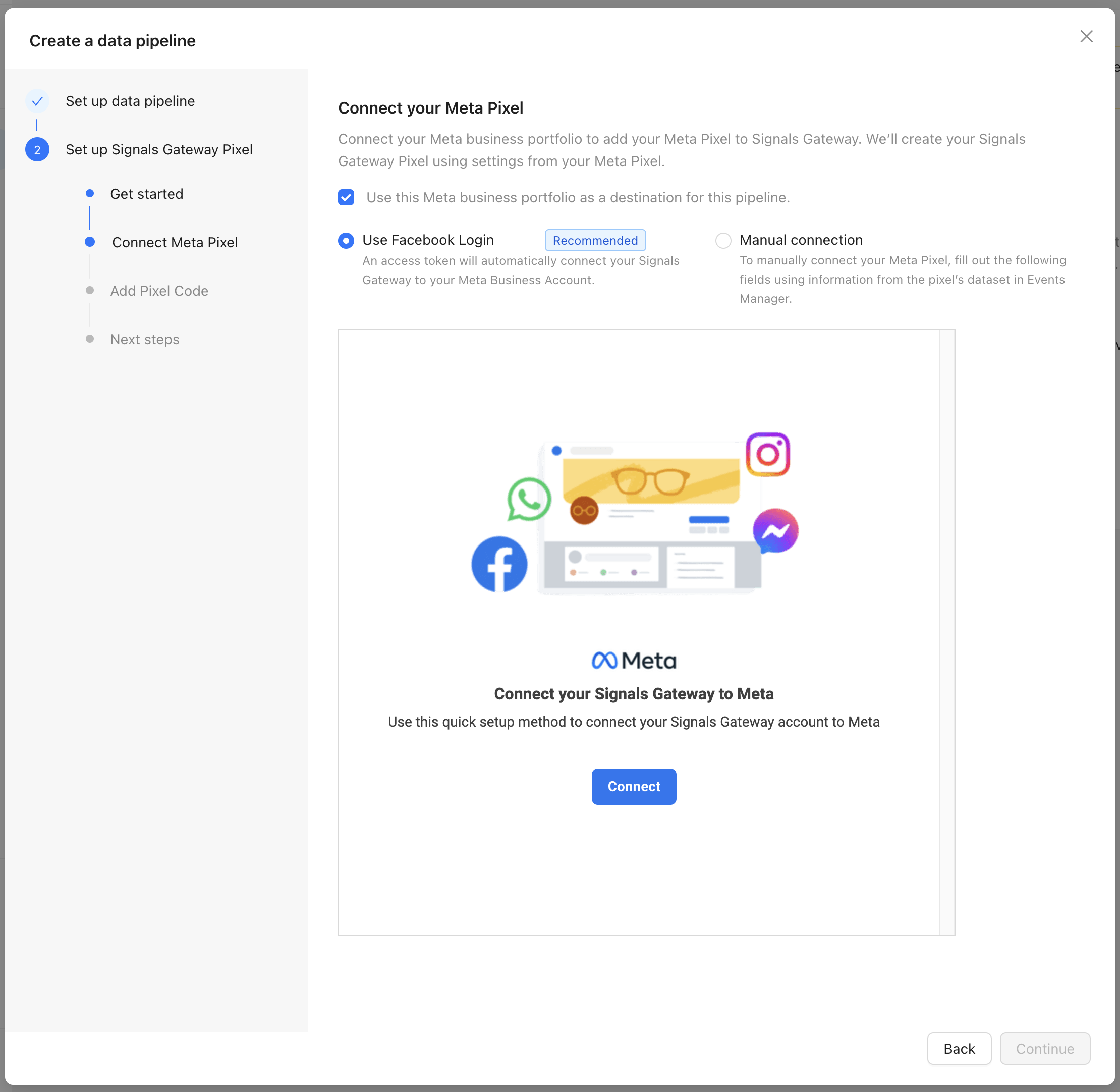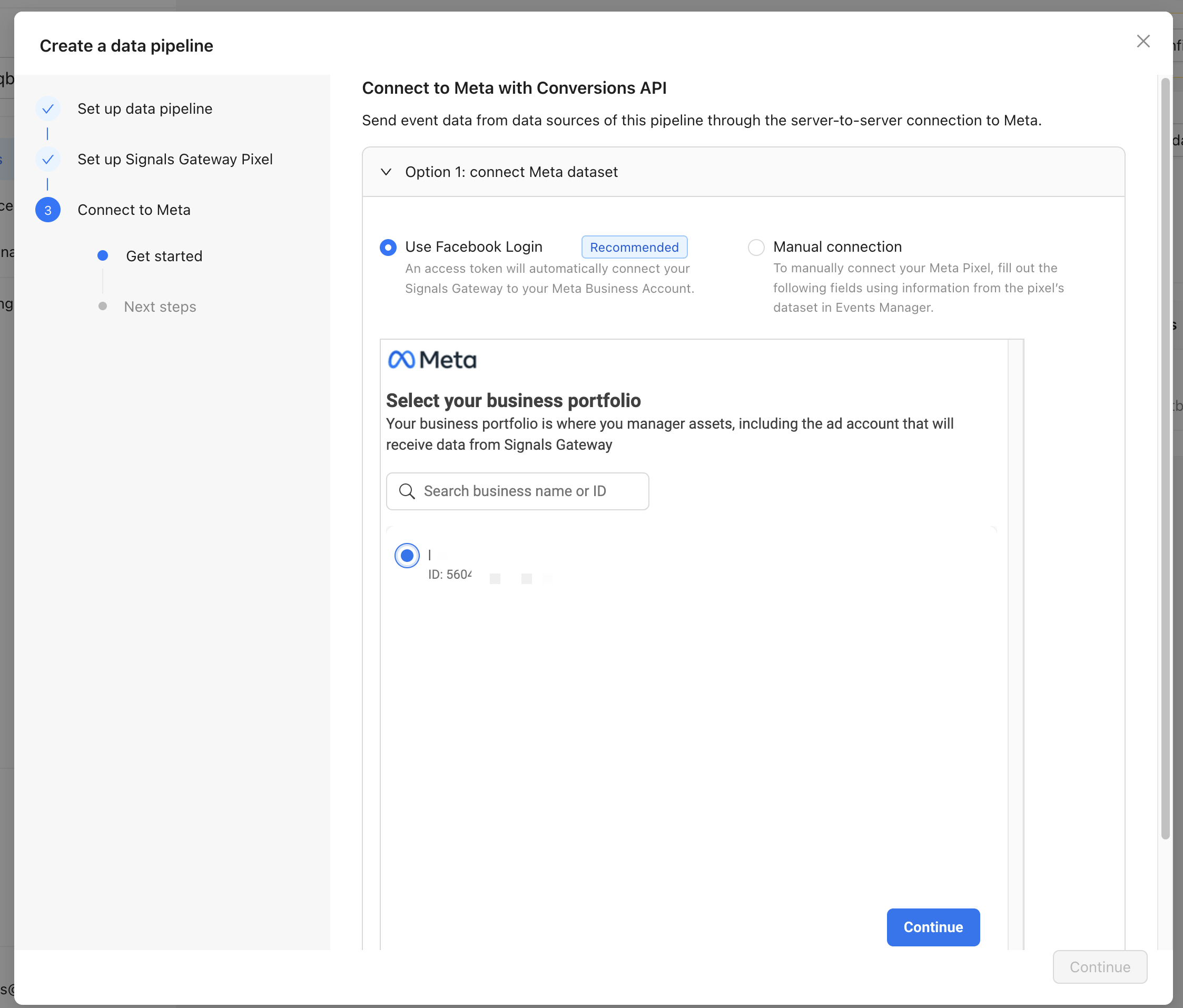 Now you need to connect the pixel with a Meta dataset. Authenticate with your Meta Business account .