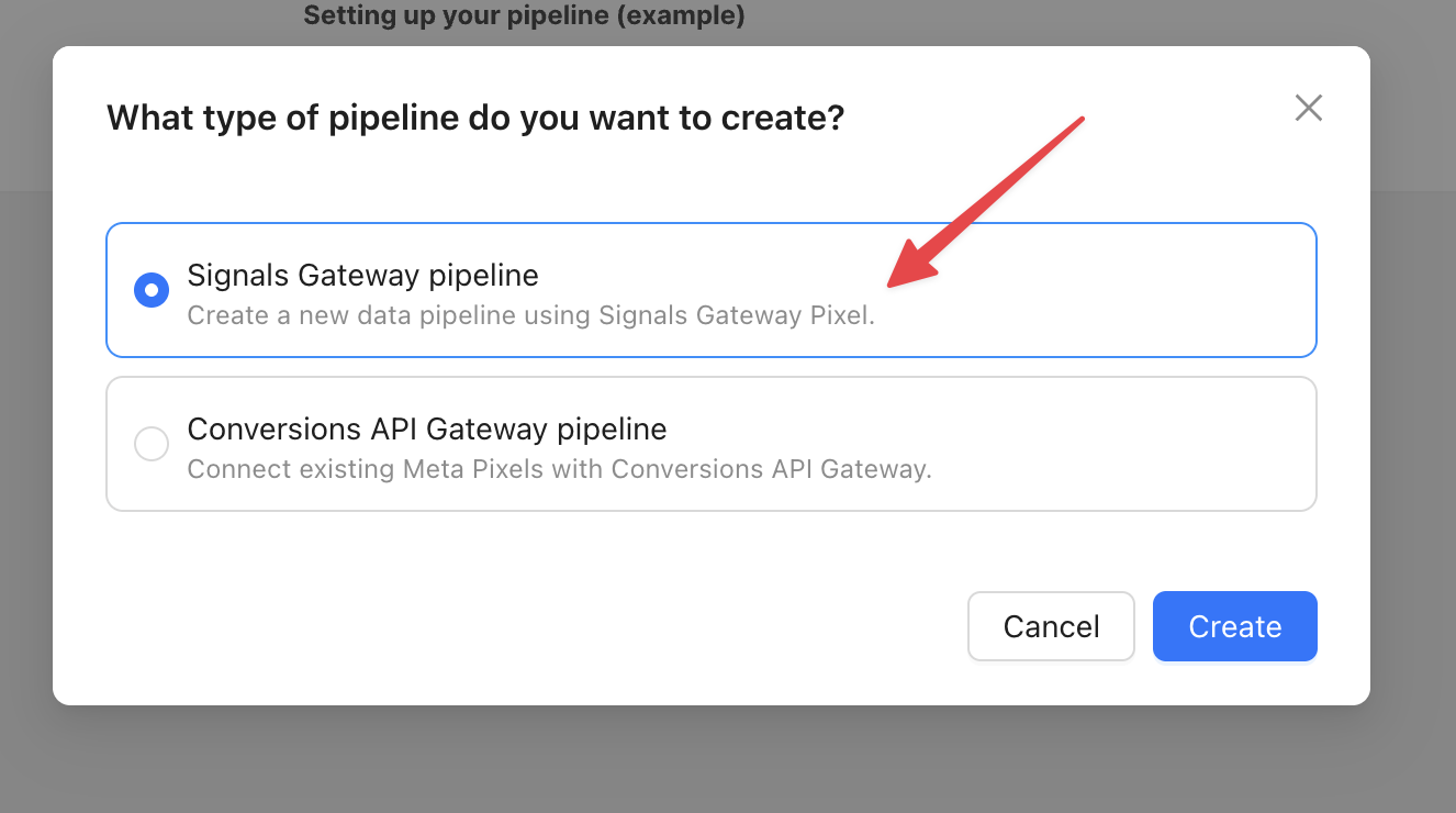 Give it a name. Select Signals Gateway Pixel as data source and Meta as destination**.**