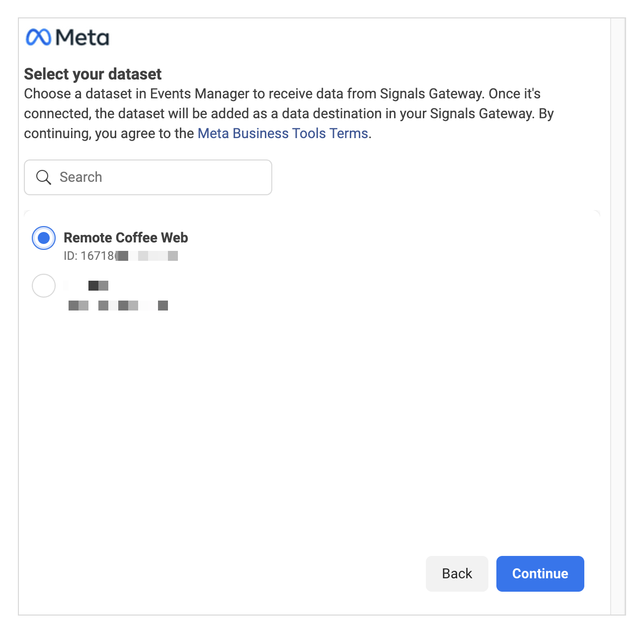 Select the Events Manager dataset that should receive data from this pixel and click Continue.