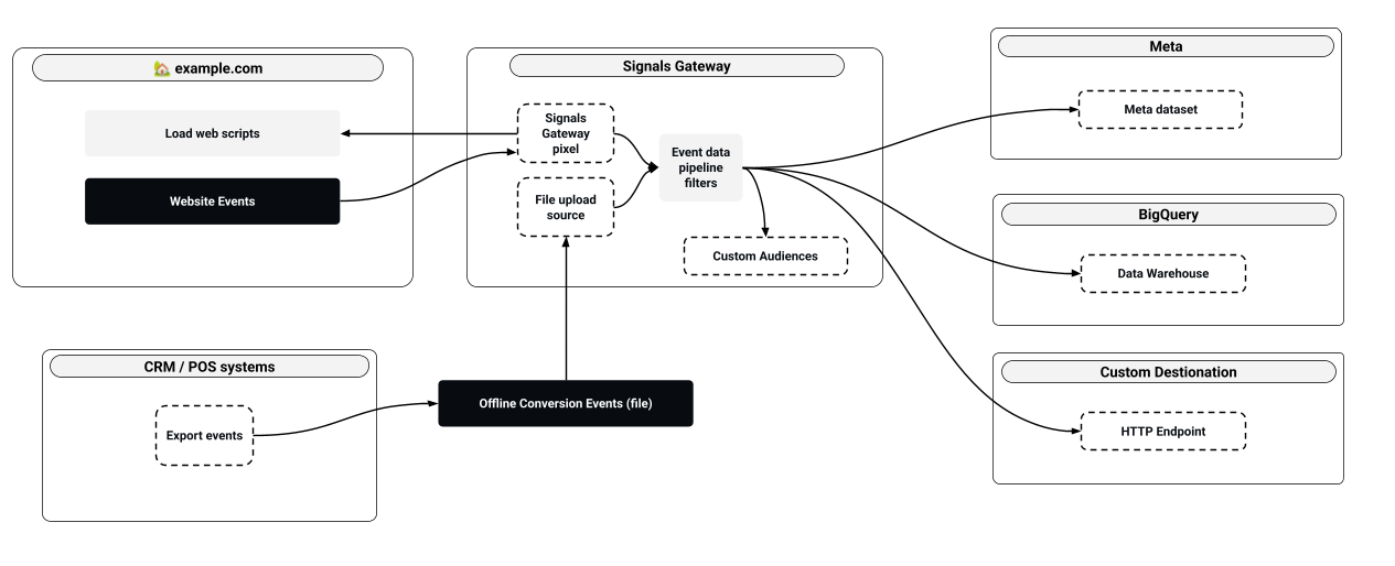 Meta Signals Gateway is a managed, cloud‑hosted data pipeline for first‑party marketing signals. It centralizes multiple inbound sources (web pixel, app/SDK, CRM and file uploads) and lets you process and forward events to one or more outbound destinations such as Meta (via Conversions API), Google BigQuery, or a custom HTTP endpoint.