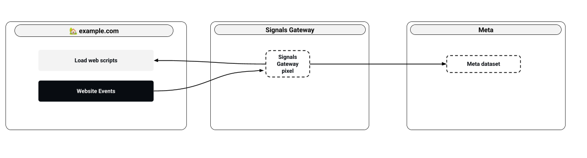 The code communicates only to the gateway, not directly to Meta — the gateway then forwards events to the chose destinations. This means the business is in control of the data that gets sent.