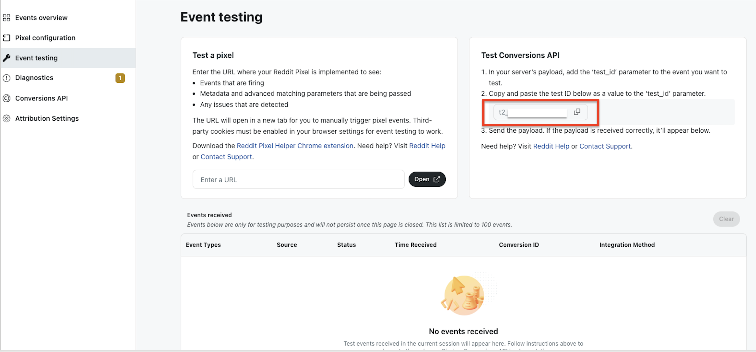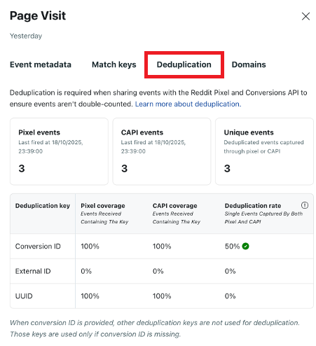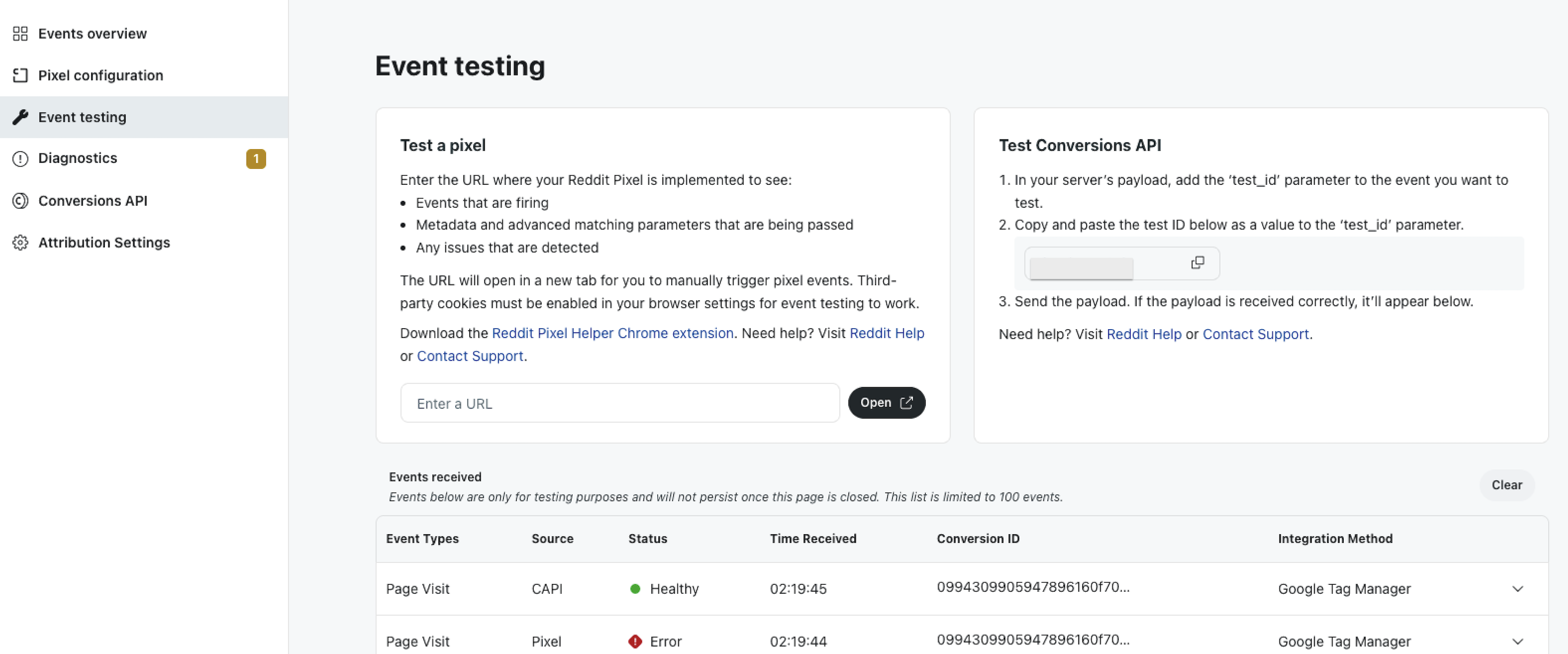 Verify in Reddit Events Manager: In the Event testing section, you should see the event activity. Crucially, you will see events arriving from the browser pixel and the server. Both events must have the same Conversion ID. Not hashed Conversion IDs from server are hashed by Reddit before they are shown.
