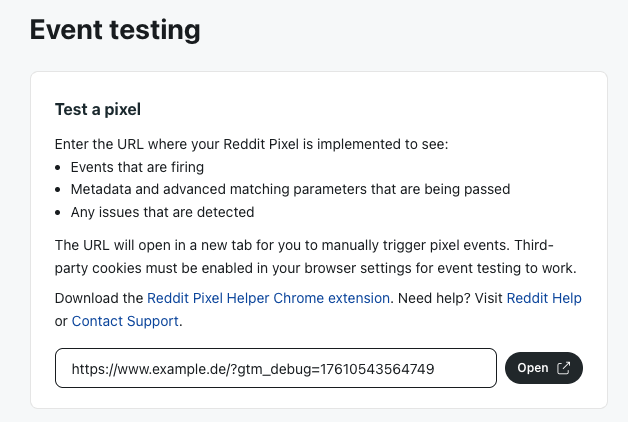 Open Reddit's Events Manager section, select the pixel and open Event testing section.