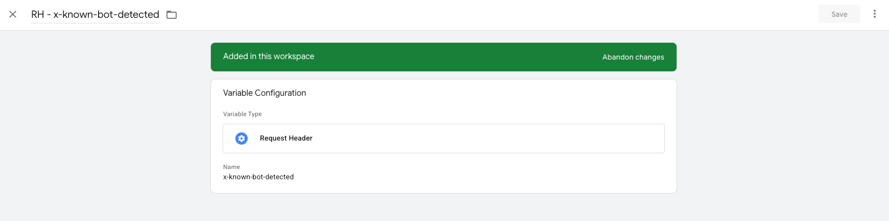 Once enabled, the X-Is-Bot header is available on every incoming request. To use it inside your container, create a Request Header variable in sGTM: