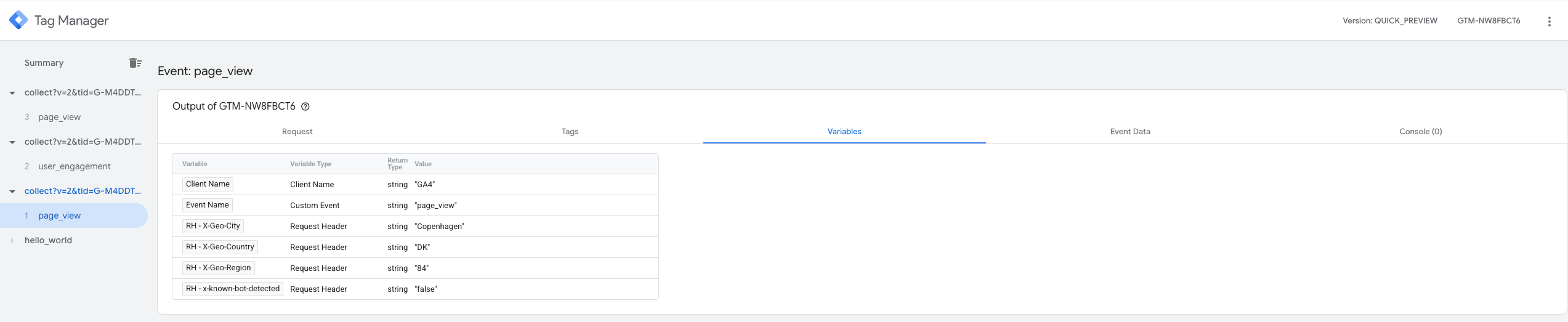 To verify that the header is arriving, open your container in Preview mode, trigger a request, and check the Incoming HTTP Request tab. You should see the RH - x-known-bot-detected header listed there.