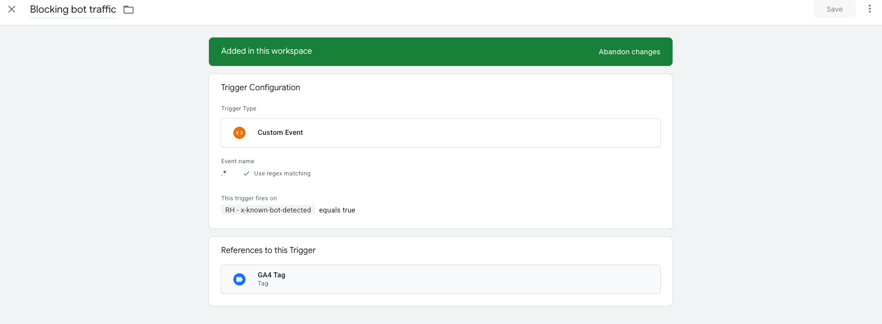 Block bot traffic from analytics: Create a blocking trigger that fires when Header - Is Bot equals true, and apply it to your GA4, Google Ads, or Meta tags. This prevents bot-generated events from inflating your reporting and skewing conversion data.