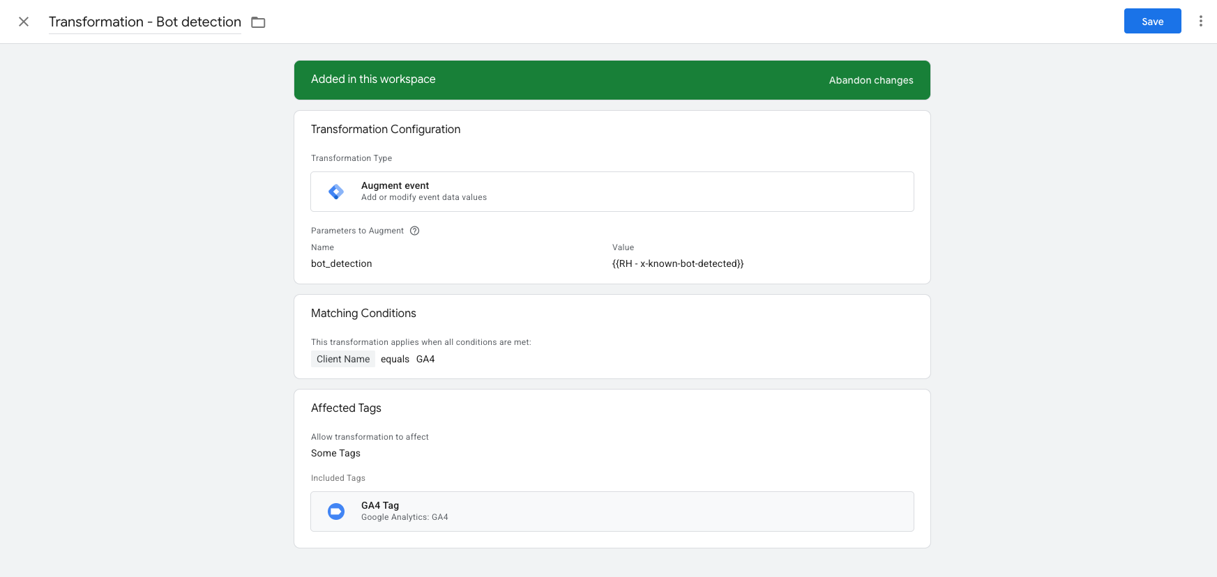 Annotate events for downstream filtering: Rather than blocking events outright, use a transformation to attach the bot classification as an event parameter (e.g. is\_bot: true). This lets your analytics team filter bot traffic in reporting tools without losing the raw data.