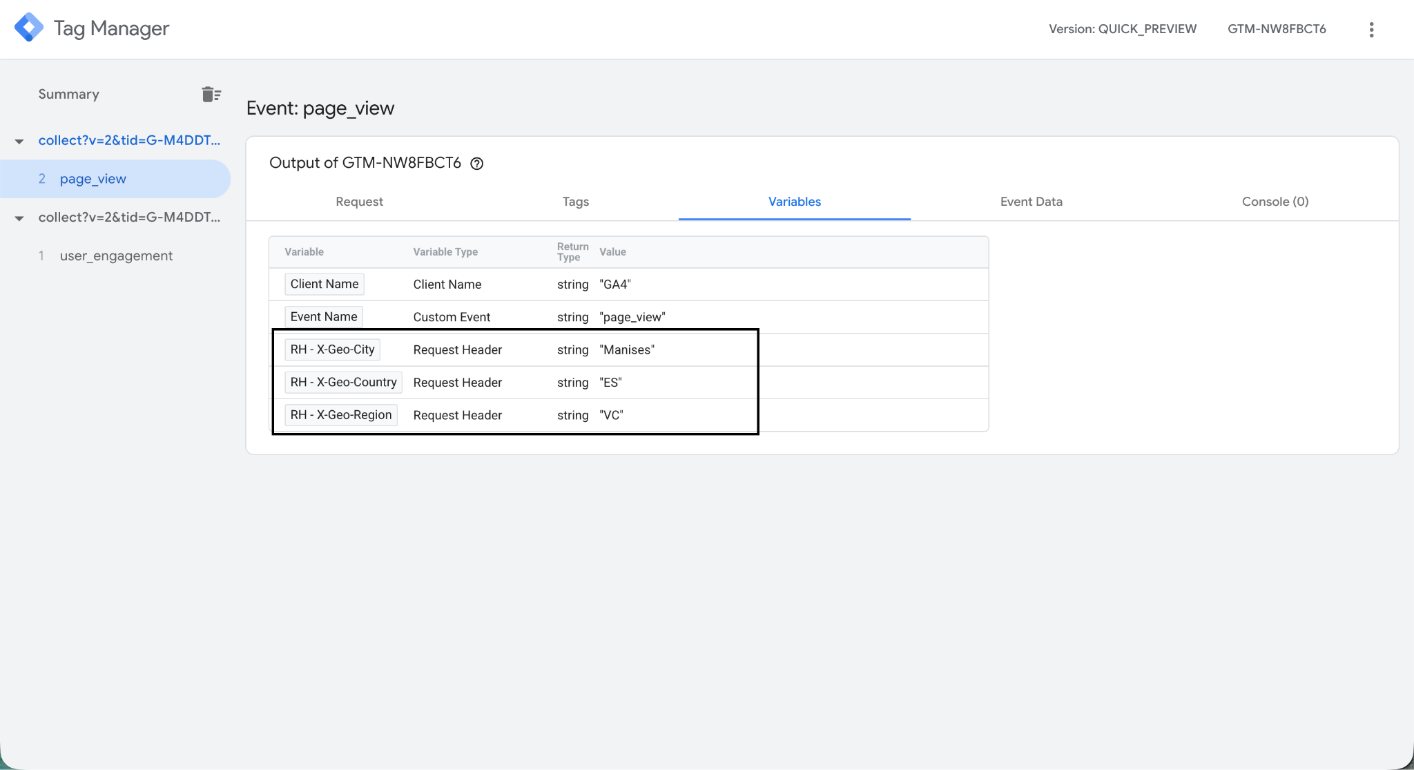 To verify the headers are arriving, open your container in Preview mode, trigger a request, and check the Incoming HTTP Request tab. You should see the X-Geo-\* headers listed there.