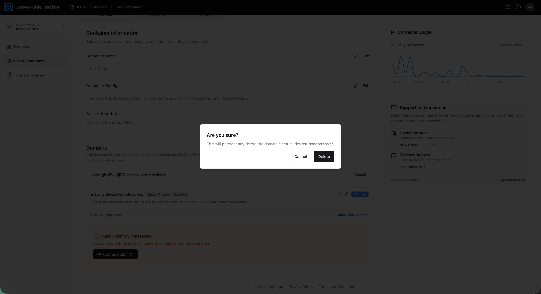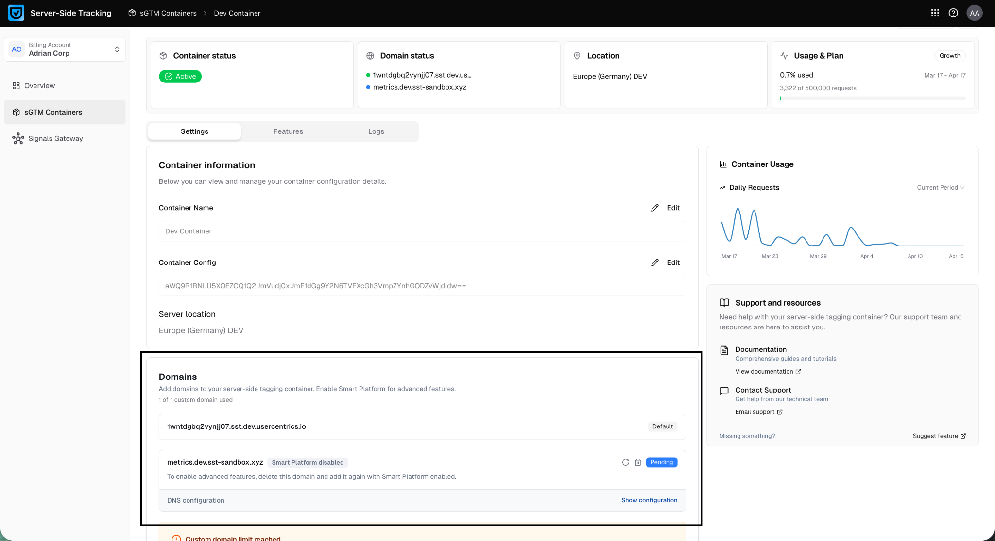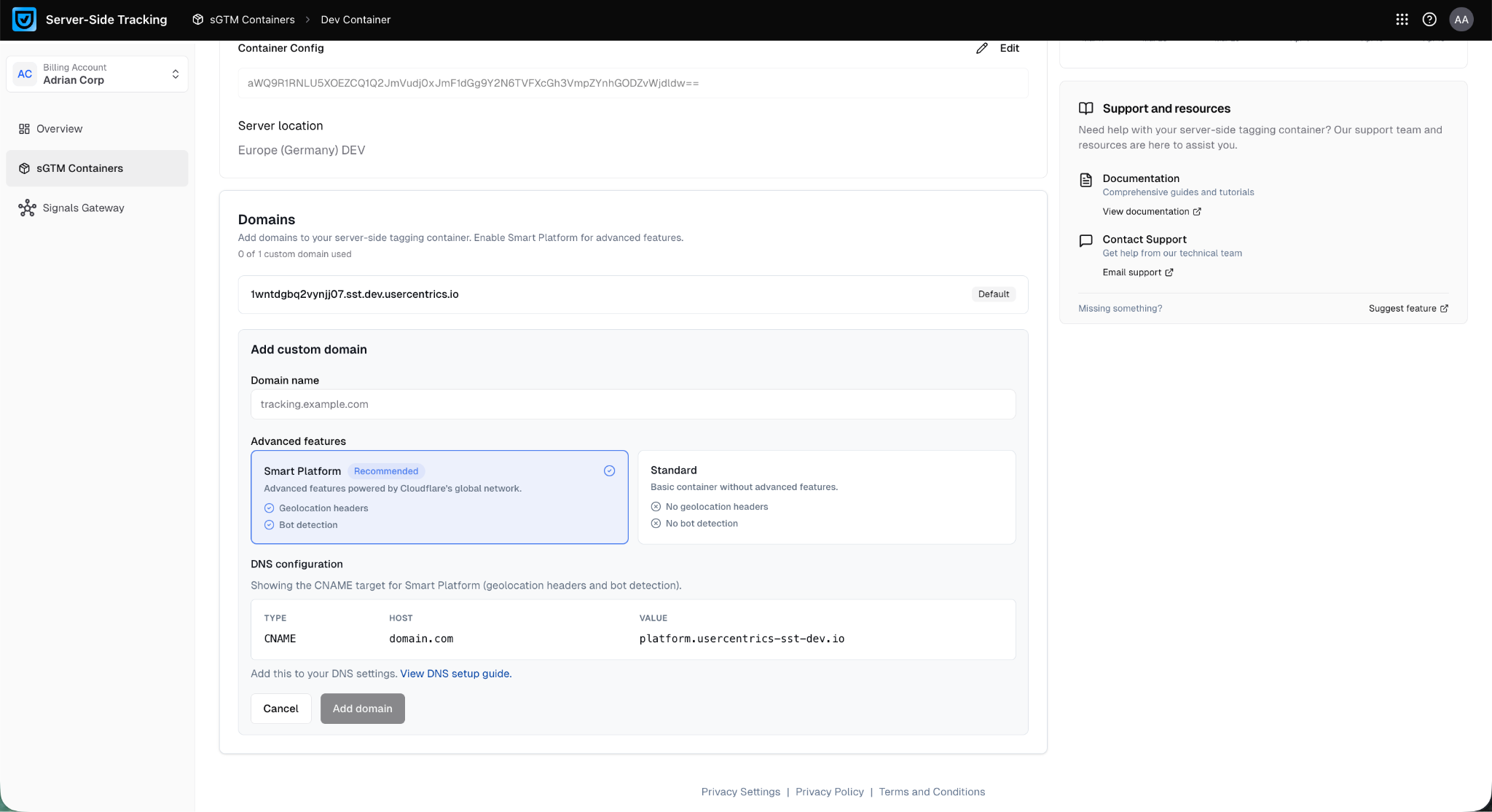 If you already have a container, and it is currently using a domain that was added without Smart Platform, you need to remove the domain and then re-add it with Smart Platform. To do so, follow these steps: