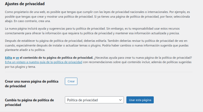 Ten en cuenta que puedes acceder a una sección específica sobre privacidad en el apartado de «Ajustes» de WordPress. Si haces clic, encontrarás este mensaje, con la opción de crear una nueva página de política de privacidad o de cambiarla.