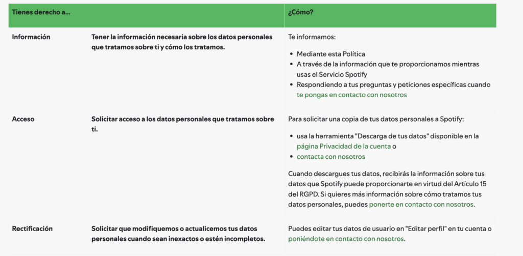 La política de privacidad de la app de Spotify destaca porque es muy estructurada, contando con un índice bien organizado y una tabla que facilita la lectura y la comprensión. Describe de forma clara las integraciones con terceros y proporciona herramientas para que cada persona pueda revisar o modificar su consentimiento desde su perfil.