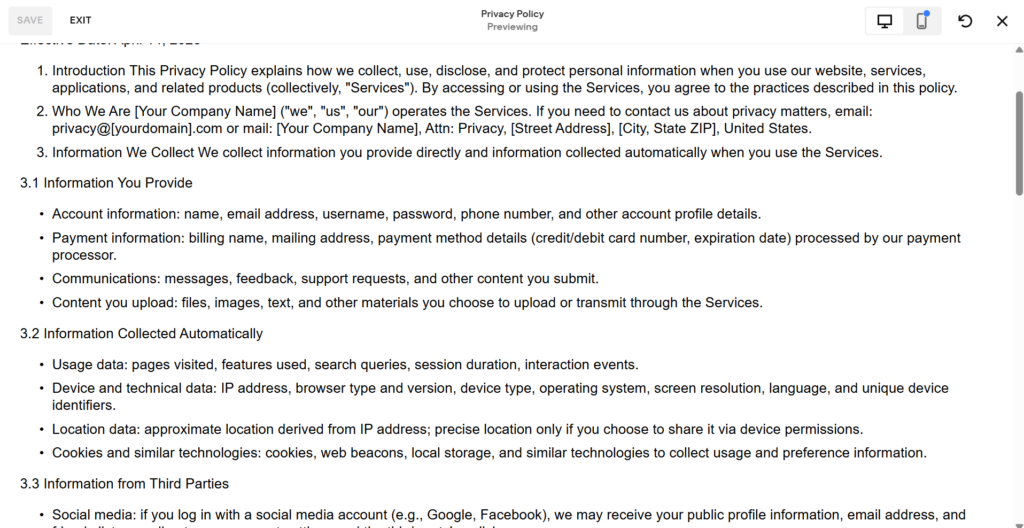 Using a template is another common approach that balances efficiency with the need for a formal document. To assist with this, Squarespace offers its own sample language designed to cover platform-specific functions like system data, functional cookies, and customer accounts.