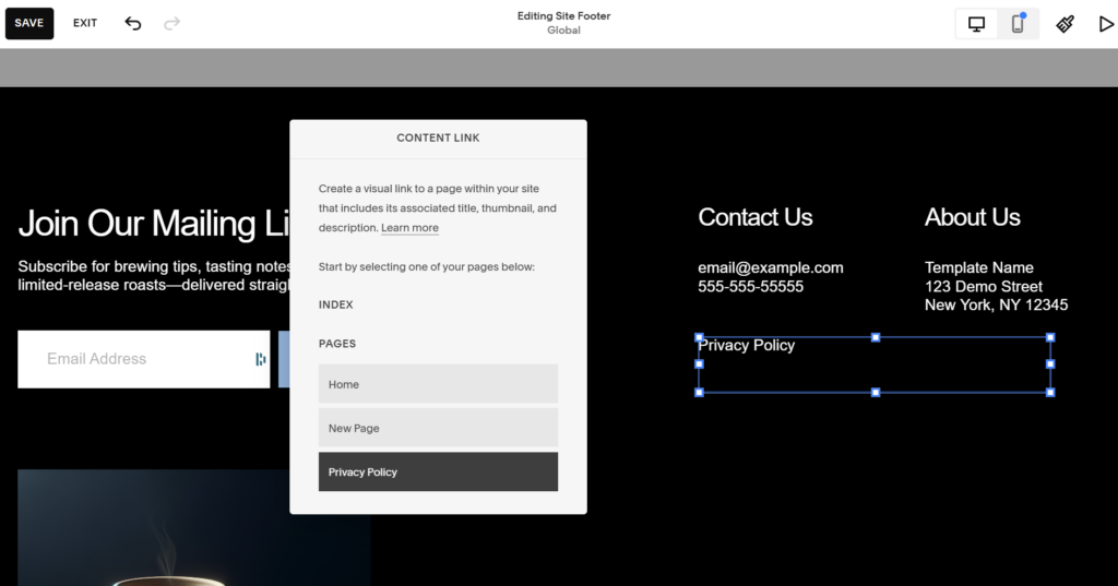 To add your privacy policy to your Squarespace website footer, enter Edit mode on any page, scroll to the bottom, and click Edit Footer. Add a Text Block or Menu Block and link to your Privacy Policy page. This makes the link visible on every page of your site.