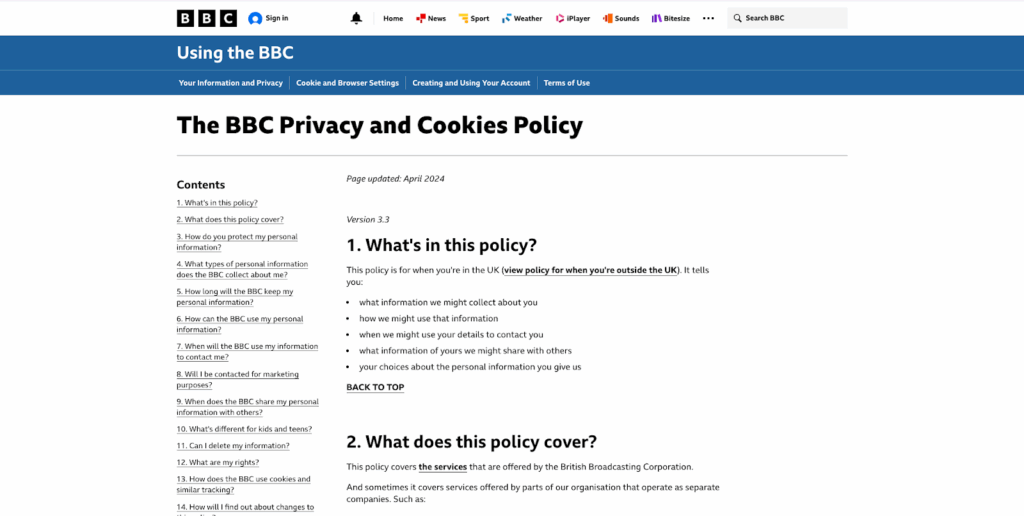 The BBC uses this model effectively. The first layer offers a concise explanation of data collection: what is collected and why. Users can then click through to explore data retention, sharing practices, or rights under the GDPR.