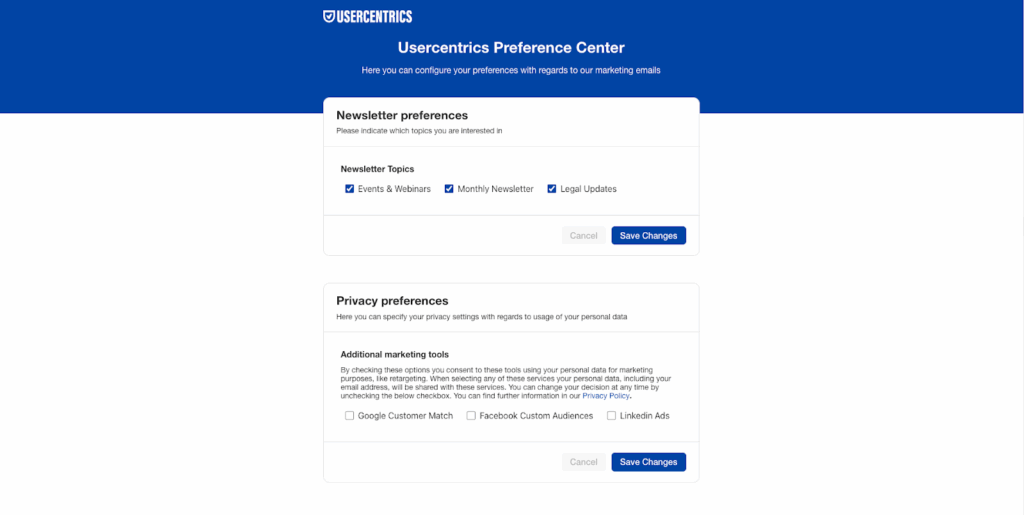 Your privacy policy must match reality. For example, if your policy says “we use cookies” your consent management platform (CMP) must actually block those cookies for EU users until consent is given. Our Usercentrics CMP helps to ensure that your business operations match your documentation and legal requirements.