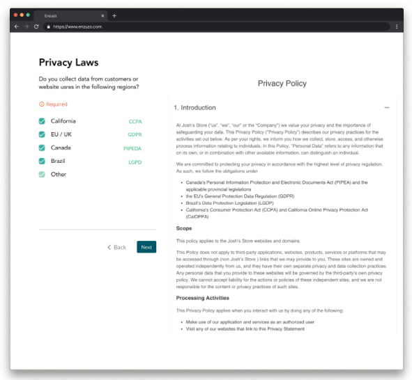 Enzuzo provides a lightweight alternative to consent management with basic cookie consent, a policy generator, and data mapping tools.