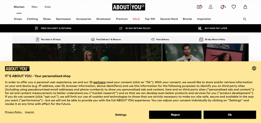 Similar to the Thomann example above, they highlight the value of consent in a catchy way with the headline “IT’S ABOUT YOU – Your personalized shop” — something that sounds much better than “Cookies used for personalization and remarketing purposes.”