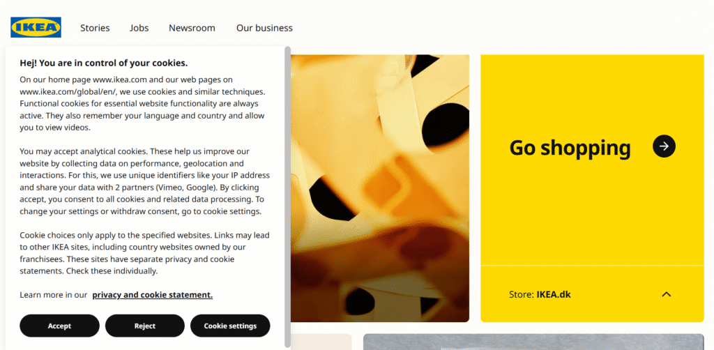 As an example, many people are familiar with IKEA’s bright visuals and use of color. Their consent banner uses a font that matches the site content, and it explains users’ options at the same time as it doesn’t obscure what’s behind it.