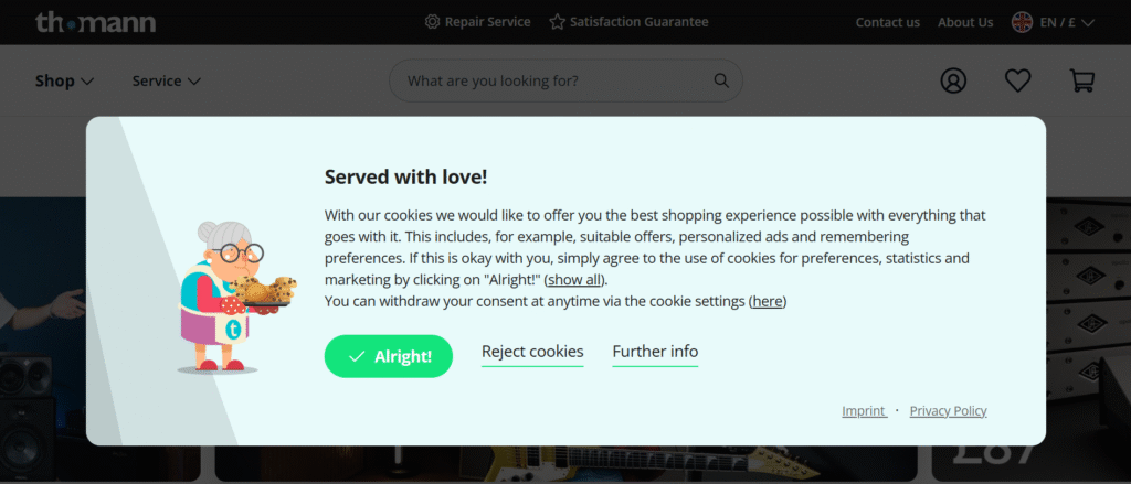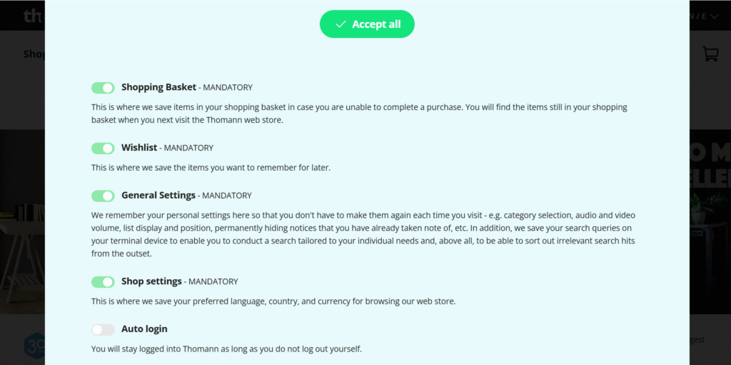 One example I particularly like is from Thomann. It’s eye-catching, explains the data purposes in simple words, and offers clear options for the decision. Plus, users can click “Further info” to find a well-structured toggle list.