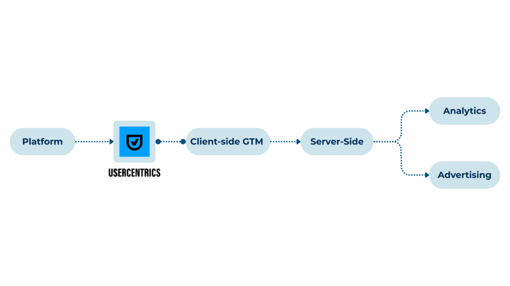 4. Propagate consent server‑side. Forward the consent state from Usercentrics CMP to your server‑side gateway so GA4/Google Ads, UET, and other APIs receive consent metadata and noncompliant events are suppressed.