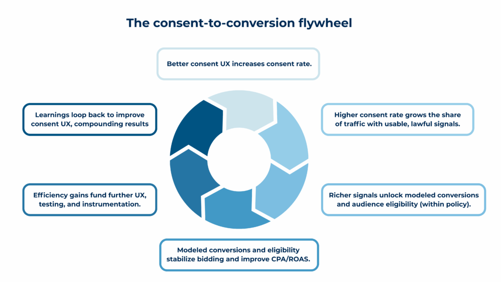 The consent-to-conversion flywheel, which shows a six-segmented circle with progressively darker blues in each segment. From the top and moving right and down, the segment descriptions are: “Better consent UX increases consent rate”, “Higher consent rate grows the share of traffic with usable, lawful signals”, “Richer signals unlock modeled conversions and audience eligibility (within policy), Modeled conversions and eligibility stabilize bidding and improve CPA/ROAS”, “Efficiency gains fund further UX, testing, and instrumentation”, and “Learnings loop back to improve consent UX, compounding results”.