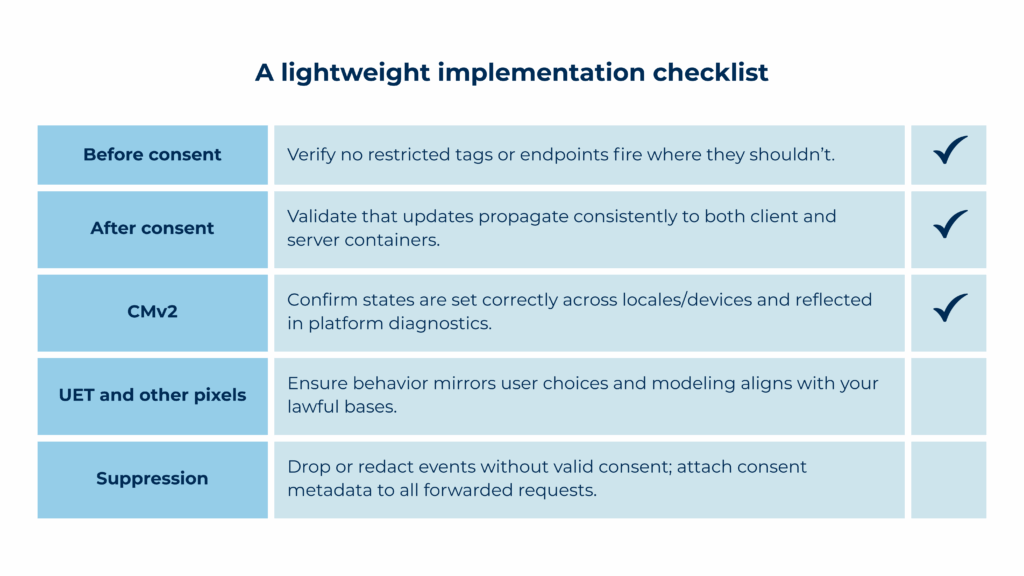 5. Test end to end. Use platform diagnostics and preview tools to validate CMv2 state, verify UET behavior, and segment analytics by consent cohort to ensure downstream performance reflects consent choices.
