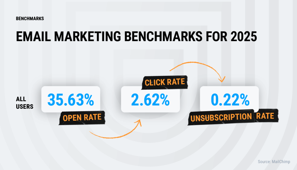 Mailchimp’s global benchmarks show an average 35 percent open rate, 2.6 percent click rate, and unsubscribe rates below 0.3 percent. Those numbers point to email being one of the most stable channels in a marketer’s toolkit, which is no easy feat in a landscape dominated by algorithmic unpredictability and fragmented user attention.