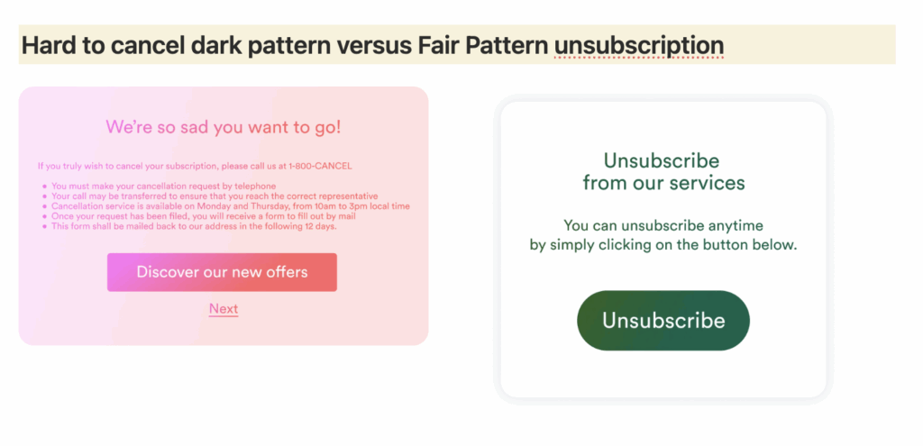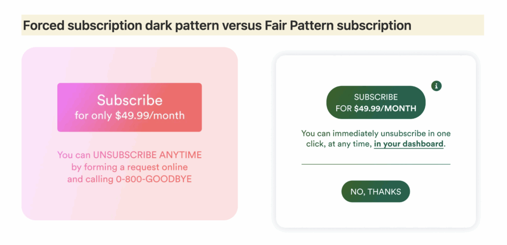 We’re also seeing it in our own data. We’ve found that fair patterns are more profitable than dark patterns after only 6 months. The reason is simple: Dark patterns like subscription traps create a mechanic turnover boost, but it’s very short-term. As soon as people realize they’ve been tricked, they’re furious and they walk away.