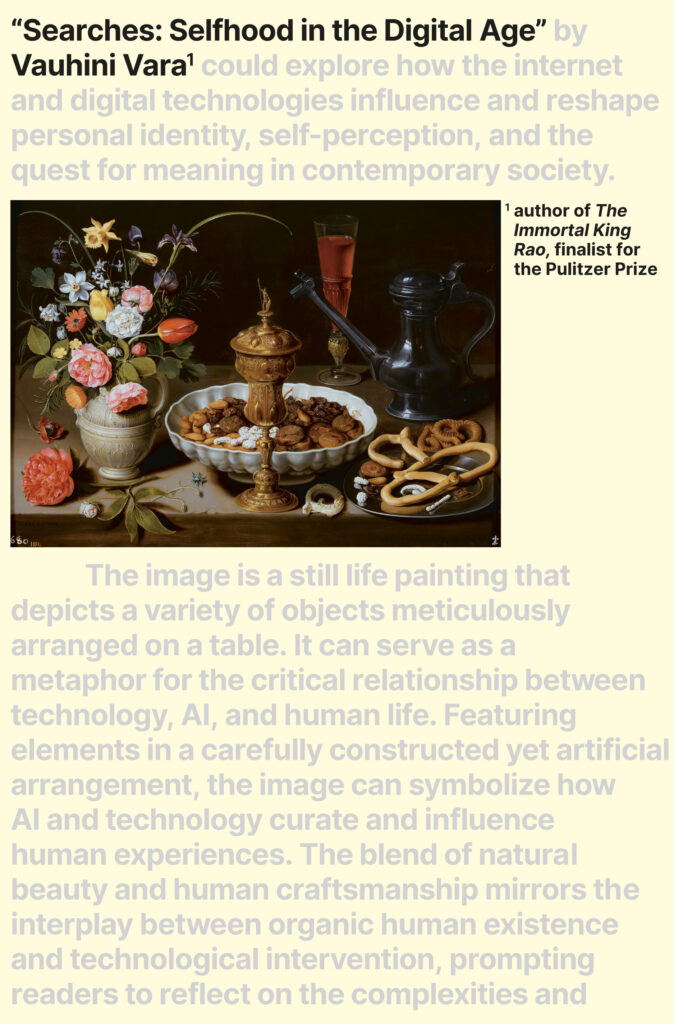 Vauhini Vara is the author of Searches, named a best book of the year by Esquire and a Belletrist Book Club pick; and which Publisher’s Weekly called a “remarkable meditation.” Her previous books are This is Salvaged, which was longlisted for the Story Prize and won the High Plains Book Award, and The Immortal King Rao, a Pulitzer Prize finalist and winner of the Colorado Book Award. She is also a journalist and a 2025 Omidyar Network Reporter in Residence, currently working as a contributing writer for Businessweek.