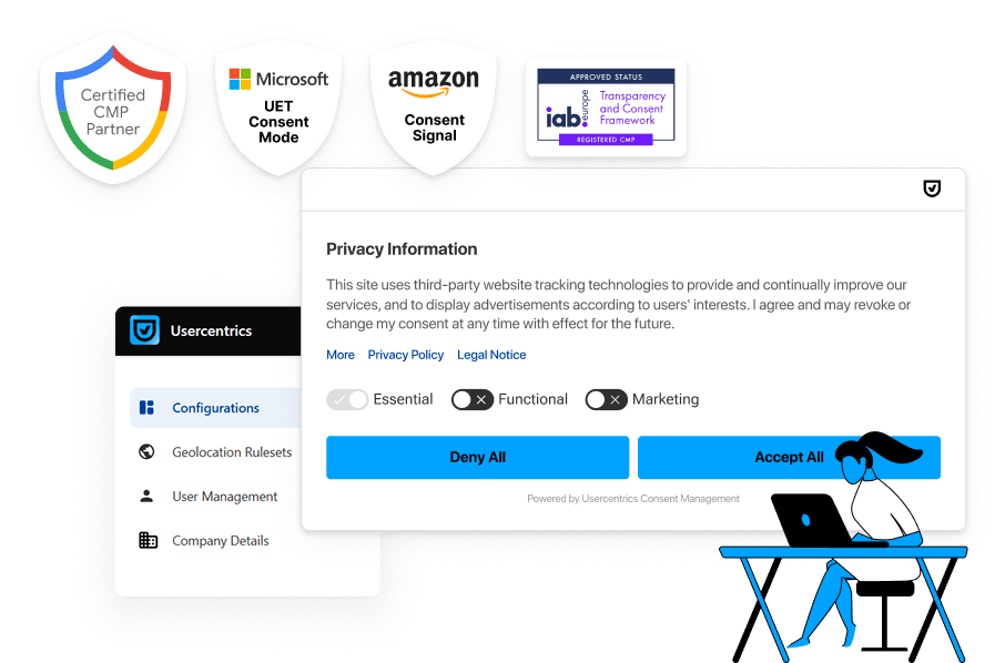Yes, the Usercentrics CMP is Google-certified. You need a CMP to set up Consent Mode v2, use of which is a Google requirement in the EU to maintain your advertising practices. Besides supporting Consent Mode, Usercentrics CMP also integrates with the TCF v2.2, enabling usage of a TCF v2.2 banner. This enables publishers to fulfill additional Google requirements for the continuation of serving ads with Google AdSense, Ad Manager, AdMob, and platforms supporting Google bidding for EEA/UK users. Learn more.